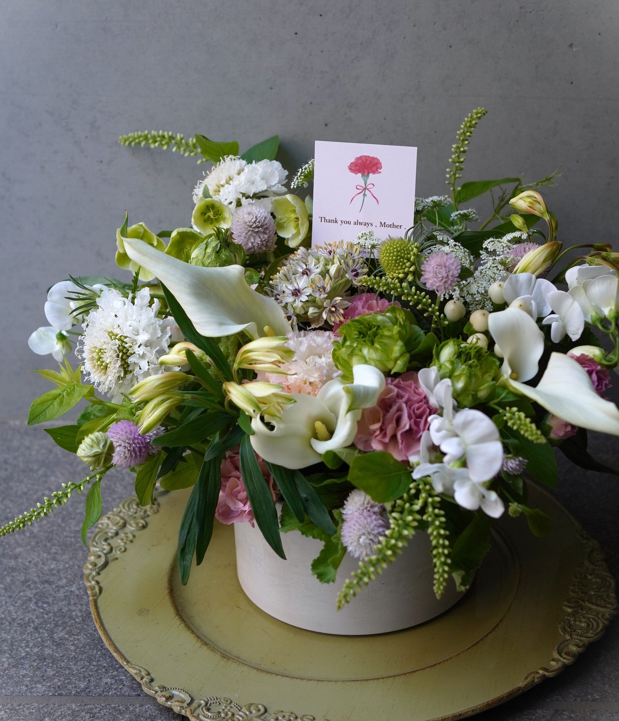 ・アレンジメントの器は指定できません、お花に合わせてセレクトしております。